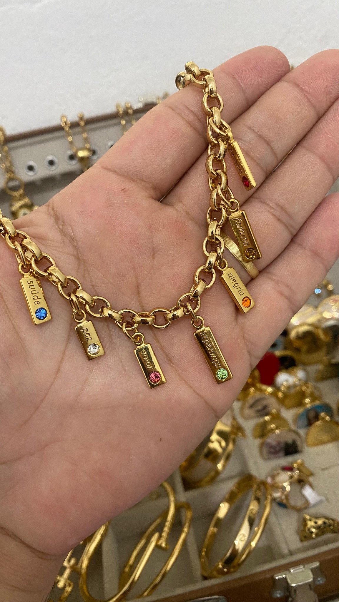 Peça banhada dourada com pingentes gravados (saúde, paz, amor, esperança, alegria, fortuna) e pedras coloridas. Qualidade BBR.